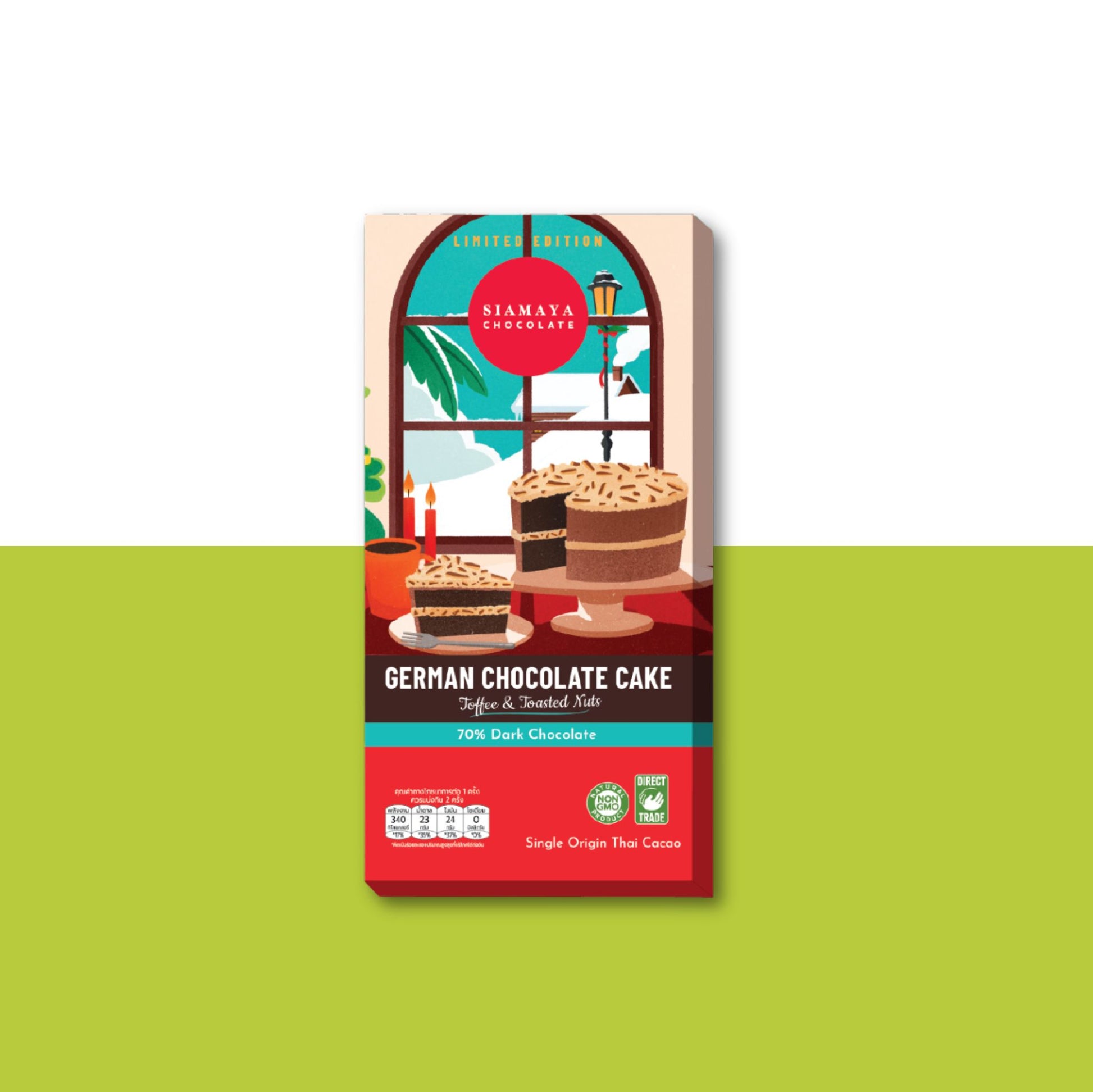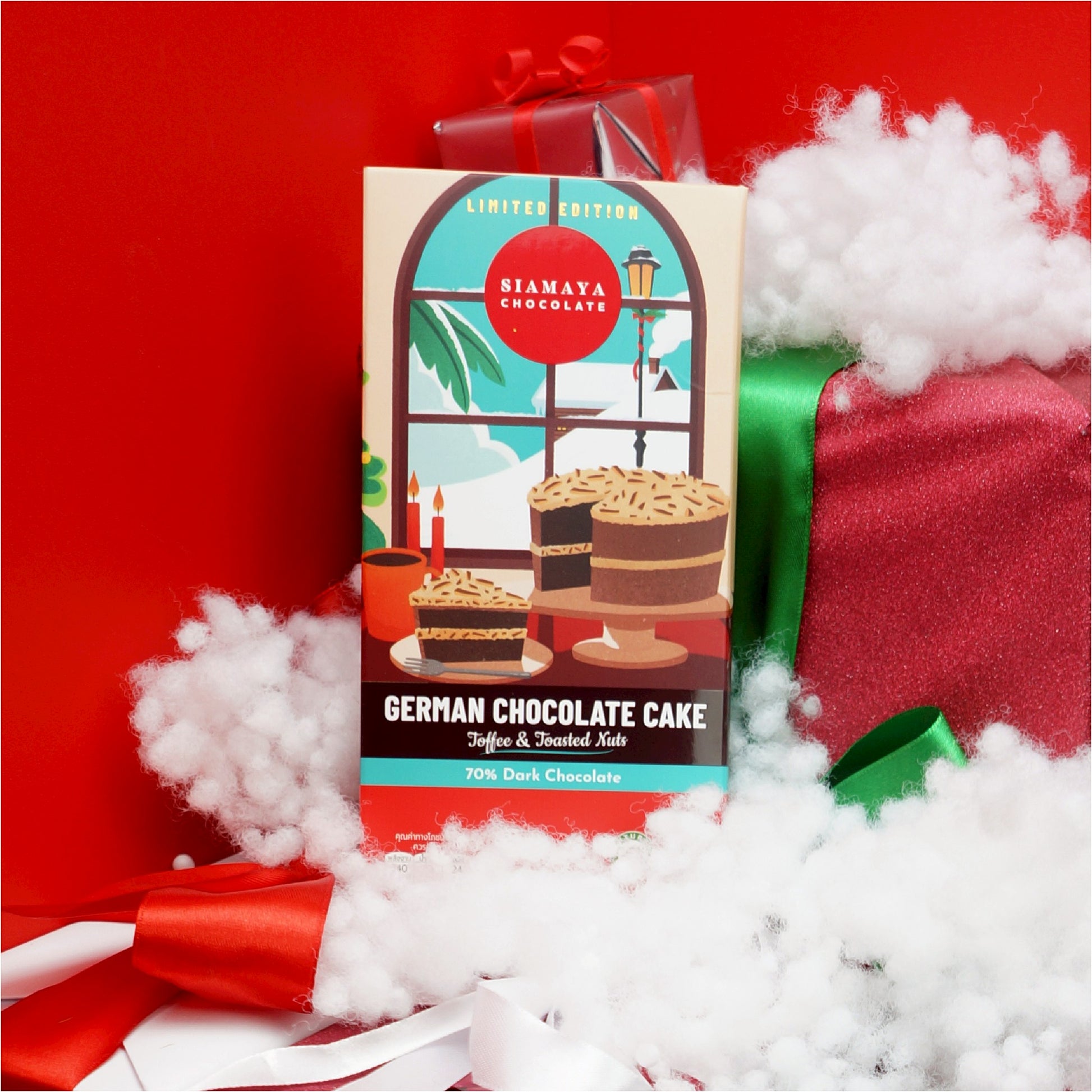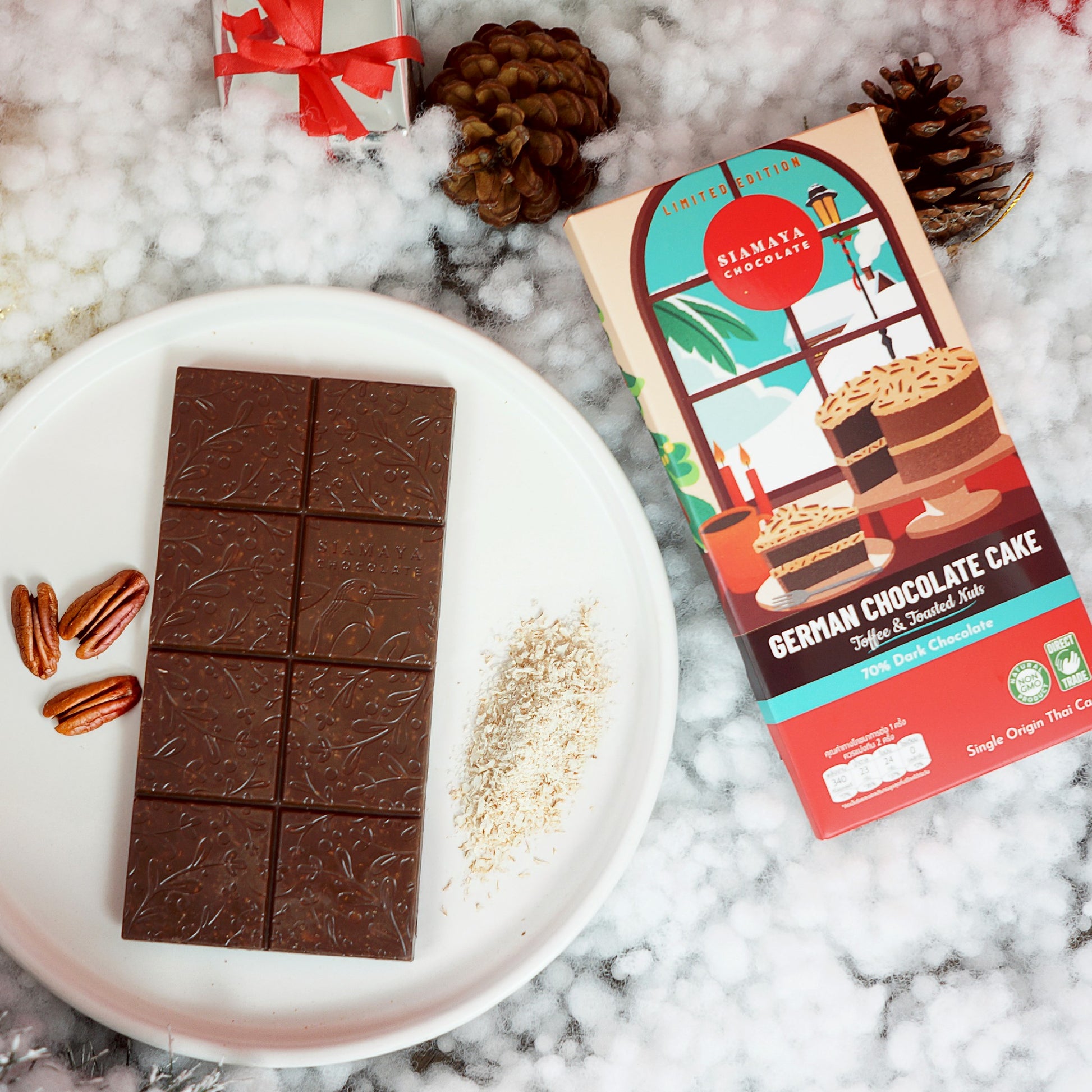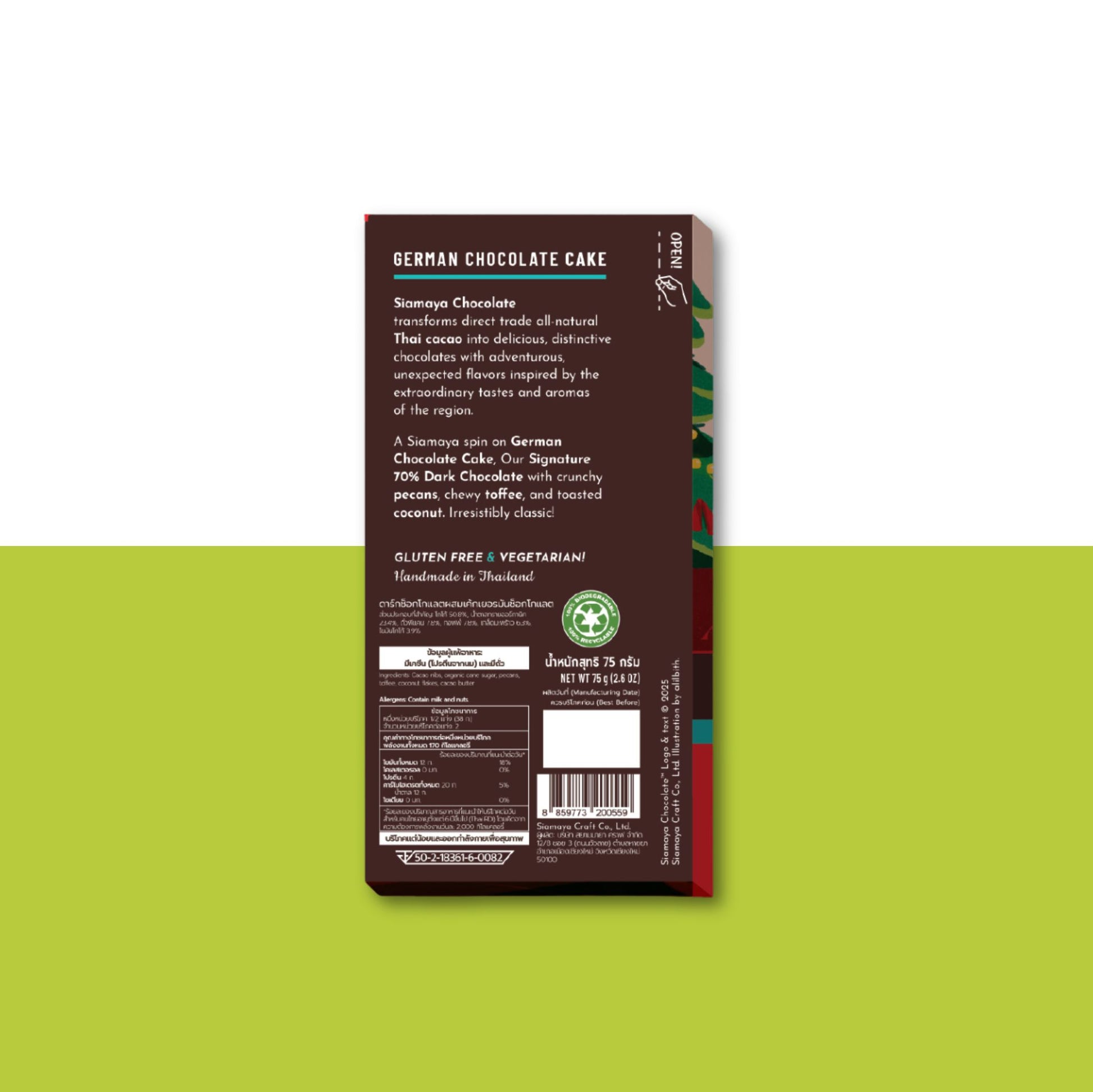 German Chocolate Cake Dark Chocolate puts a Siamaya twist on the classic dessert. Our signature 70% dark chocolate is blended with crunchy pecans, chewy toffee, and toasted coconut, creating a rich and textured experience. You’ll love the indulgent, perfectly balanced flavors of this irresistibly classic chocolate bar.