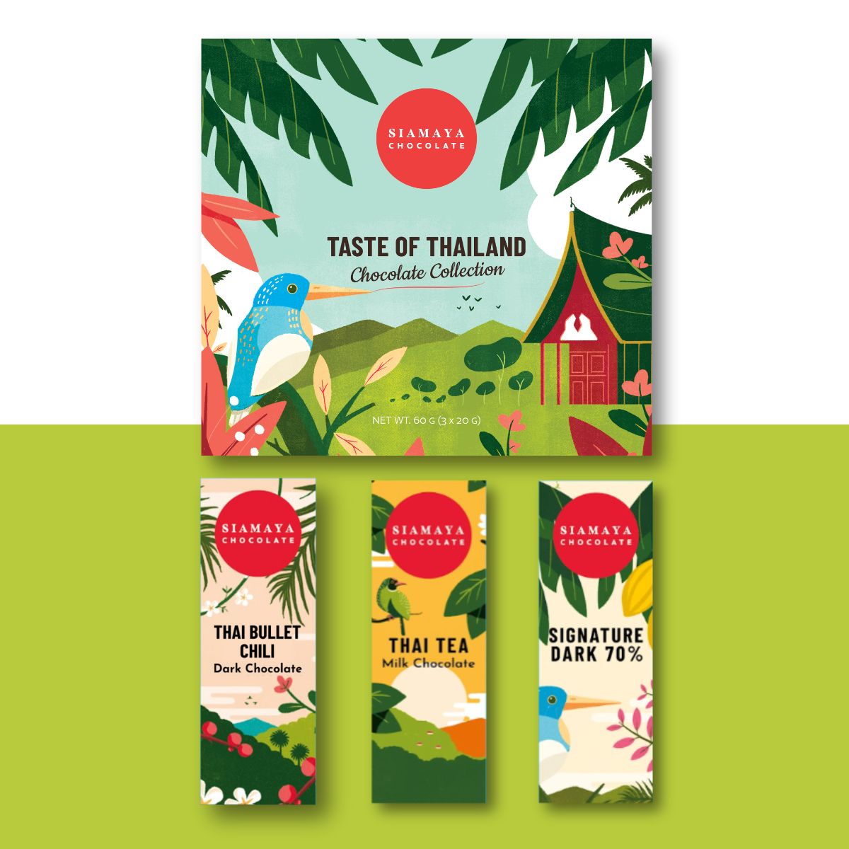 This exclusive set features three chocolate bars, each capturing the vibrant taste of Thailand: